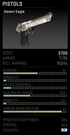Deagle je jedna z najsilnejších zbrani v hre counter strike ale má malo nábojov, malú kadenciu a pri rýchlej streľbe aj nízku presnosť. Avšak osobe ktorá vie ovládať tuto zbraň, poskytuje nesmiernu výhodu nielen v prvom kole. Najdôležitejšie pri tejto pištolí je prvý náboj ktorý býva najpresnejší a zranenému nepriateľovi často zoberie všetky zvyšne HP.